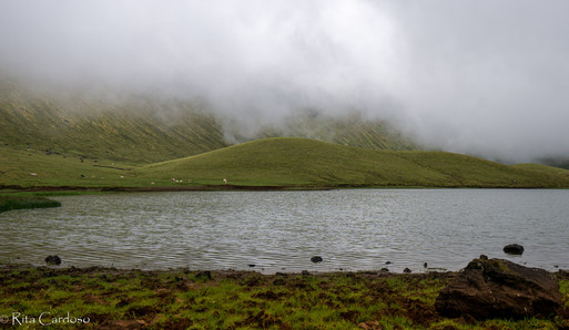 Caminhámos mais um pouco e em breve a chuva parou, o que deu para dissipar alguma da neblina e ter uma visão mais abrangente do caldeirão. O verde incrível por todo o lado, as vacas a pastar, a lagoa de contornos serpenteantes que mais parecem duas, os montes plantados no meio (de nome Cavaleiro e Marco), a micro-floresta de umas 20 árvores se tanto, na verdade, foi fechar os olhos e trocar as vacas por ovelhas e senti-me de volta à minha Islândia. Ah, e também trocar as mil hortênsias dali pelos tremoceiros que nascem na Islândia, mas as tonalidades são parecidas.