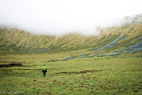 Ao descer um caminho que está mais ou menos arranjado com algumas pedras, começámos a descortinar alguns contornos das paredes da cratera, o nevoeiro estava a passar por cima do caldeirão e nós atravessámo-lo, como se de um portal se tratasse. Uma das coisas que não estava à espera, foi o facto de haver imensas vacas e até cavalos a pastar por ali dentro, não me devia pasmar, aliás estávamos nos Açores, não é?