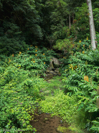 After visiting Sanguinho, we follow the trail to the waterfall, which is beautiful, with many endemic and varied plants, with Incense (Pittosporum undulatum) and Acacia (Acacia melanoxylon) being the predominant species. The trail also passes through some private orchards (do not remove anything without authorization, of course) and there is also a strong possibility of getting some pretty nice scares with some chickens and roosters that live there.