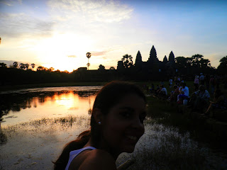 Não conseguimos subir a colina sem antes comprar uma camisola, pois estava de alças, e elas umas calças, estavam de calções, e qual não foi a nossa desilusão quando chegámos ao topo e estava uma fila enorme. Percebemos que era impossível subir a tempo ao templo, pelo que resolvemos descer um pouco e ficar num dos miradouros a ver o pôr do sol. O Cambodja brindou-me com os melhores que já vi na minha vida.